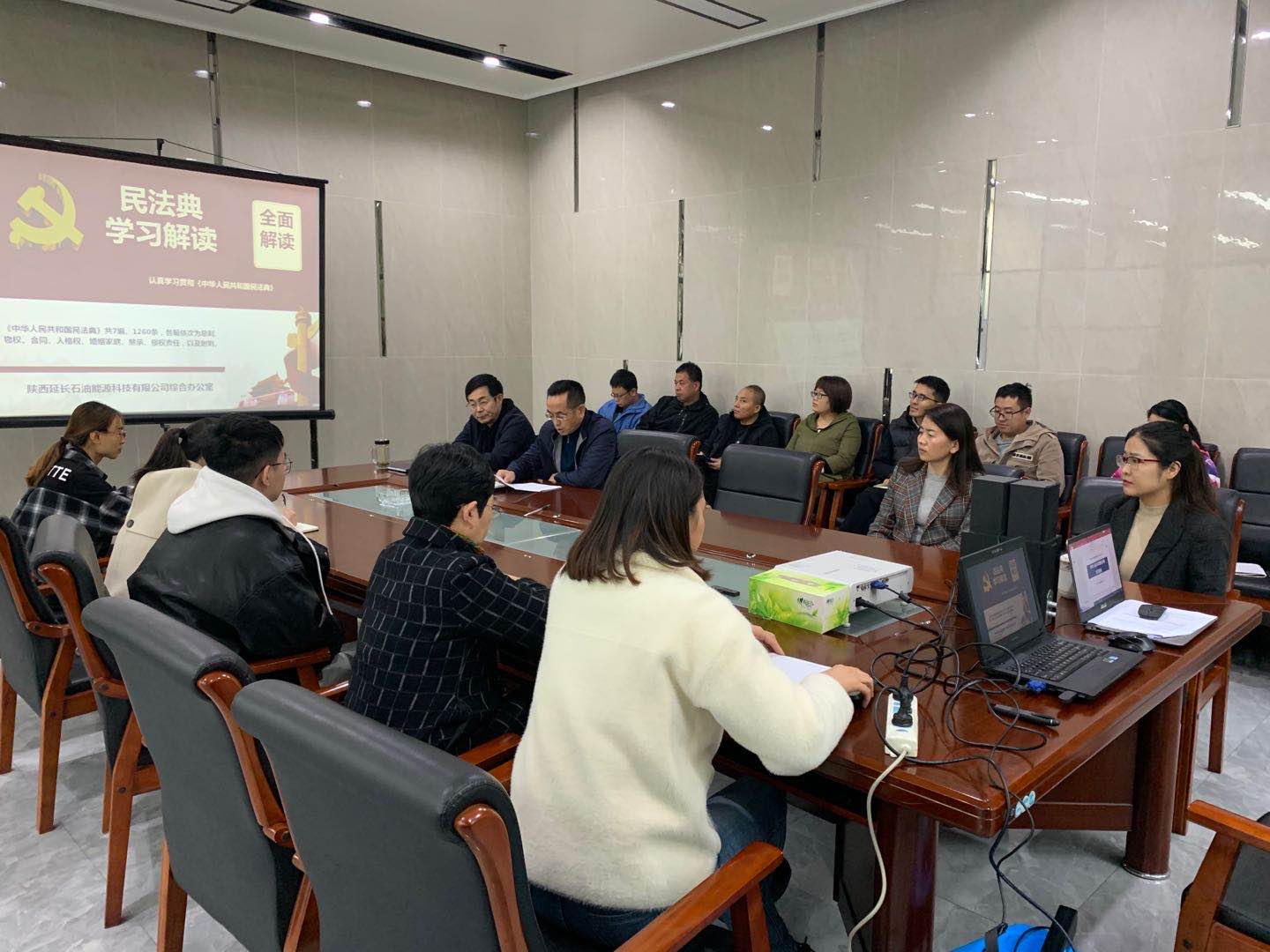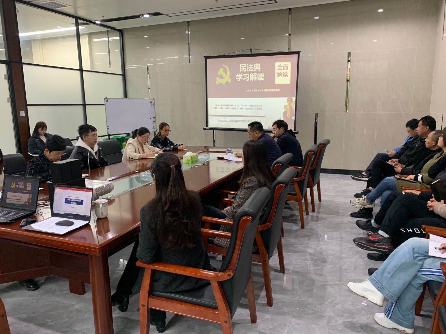 10月下15日能源科技公司在会议室举办了《中华人民共和国民法典》培训学习,培训由陕西睿和律师事务所屈硕律师讲授,公司领导及员工参加了学习。